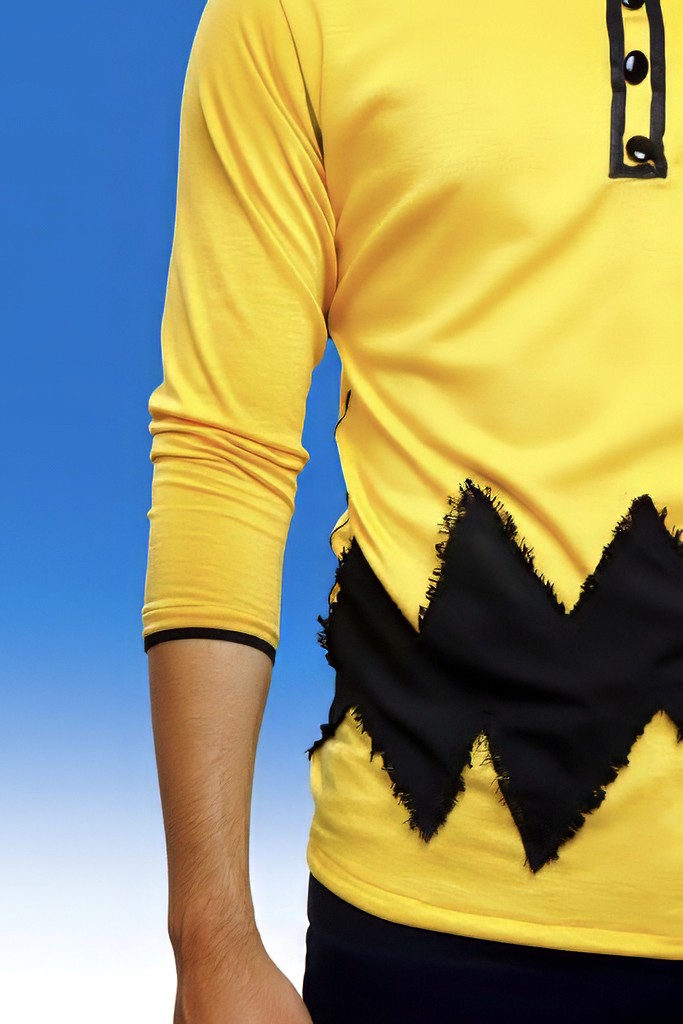El jersey de Charlie Brown está hecho con algodón con elastano en amarillo intenso, para que fuera cómodo y mantuviera su forma. La franja en zigzag no está impresa: es una tela negra mate colocada encima, con bordes deshilachados para dar textura y profundidad.